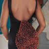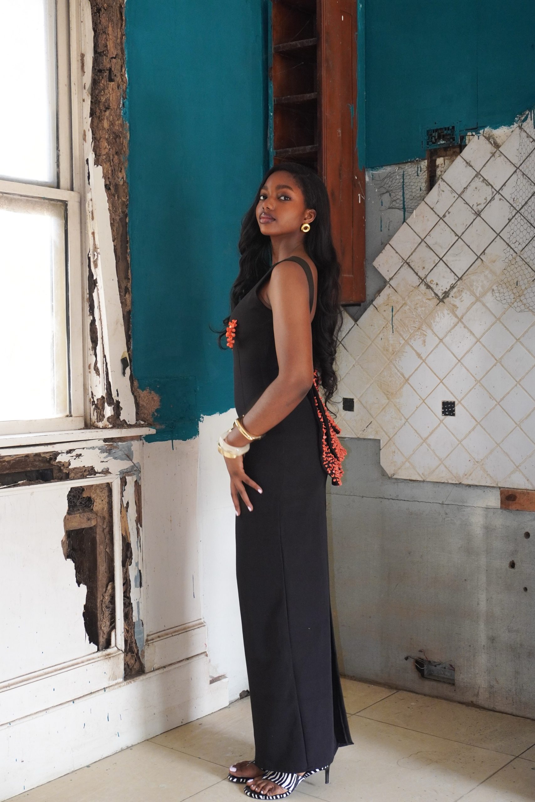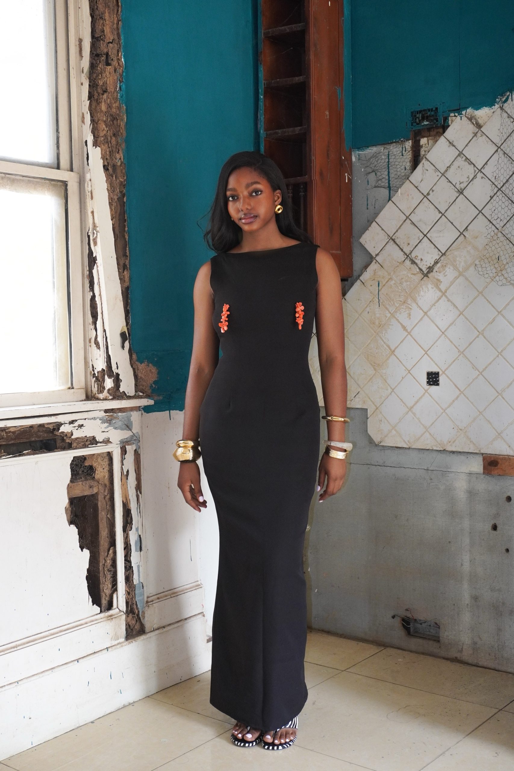 A sculptural black maxi dress designed to celebrate form, texture, and contrast. Crafted in a sleek, body-skimming silhouette, this piece features a clean boat neckline and a dramatic open-back detail that elongates the frame. Coral bead embellishments are delicately placed on the front bodice, creating a striking focal point, while a hand-beaded flap at the back adds unexpected movement and intrigue.