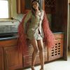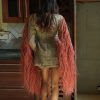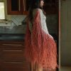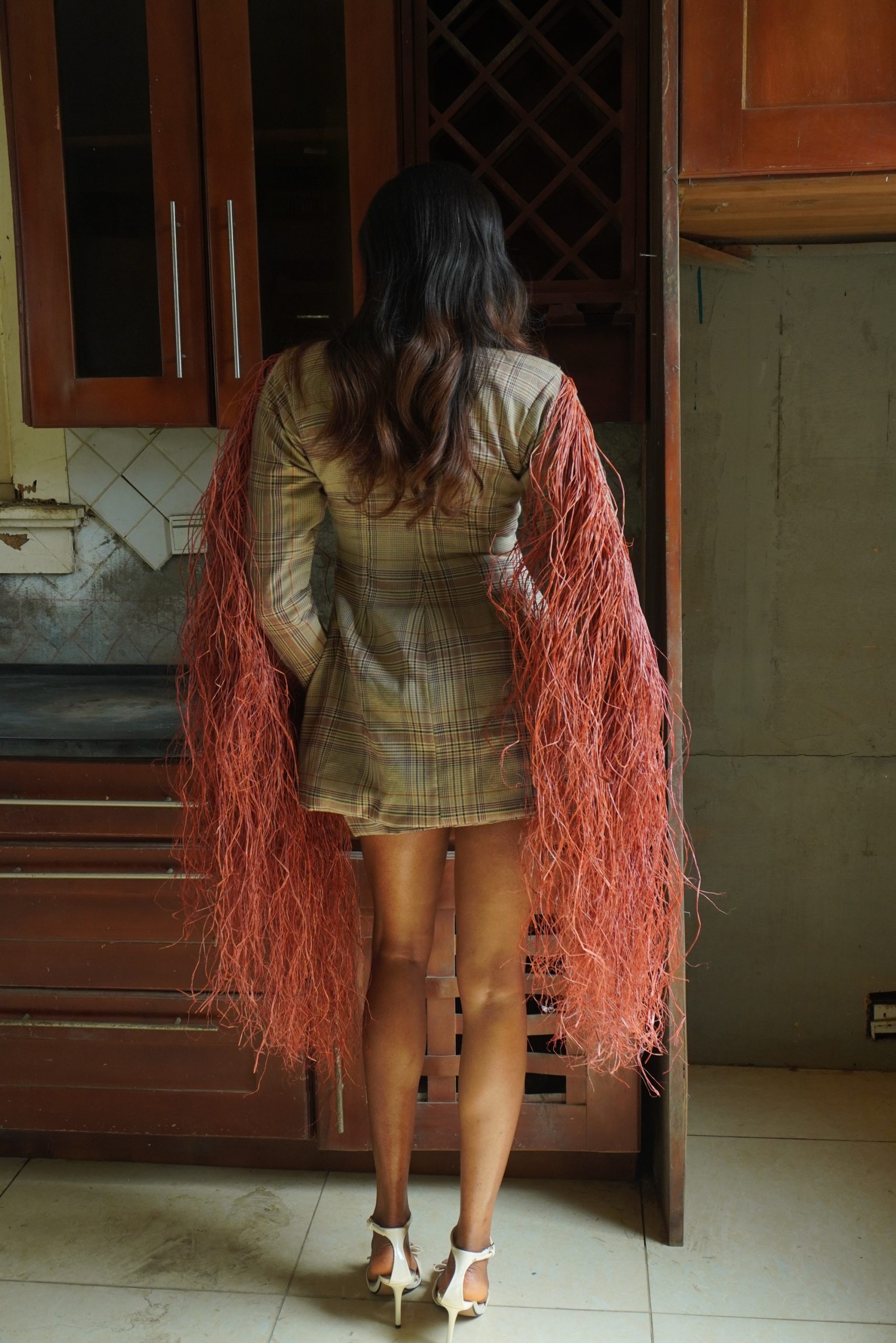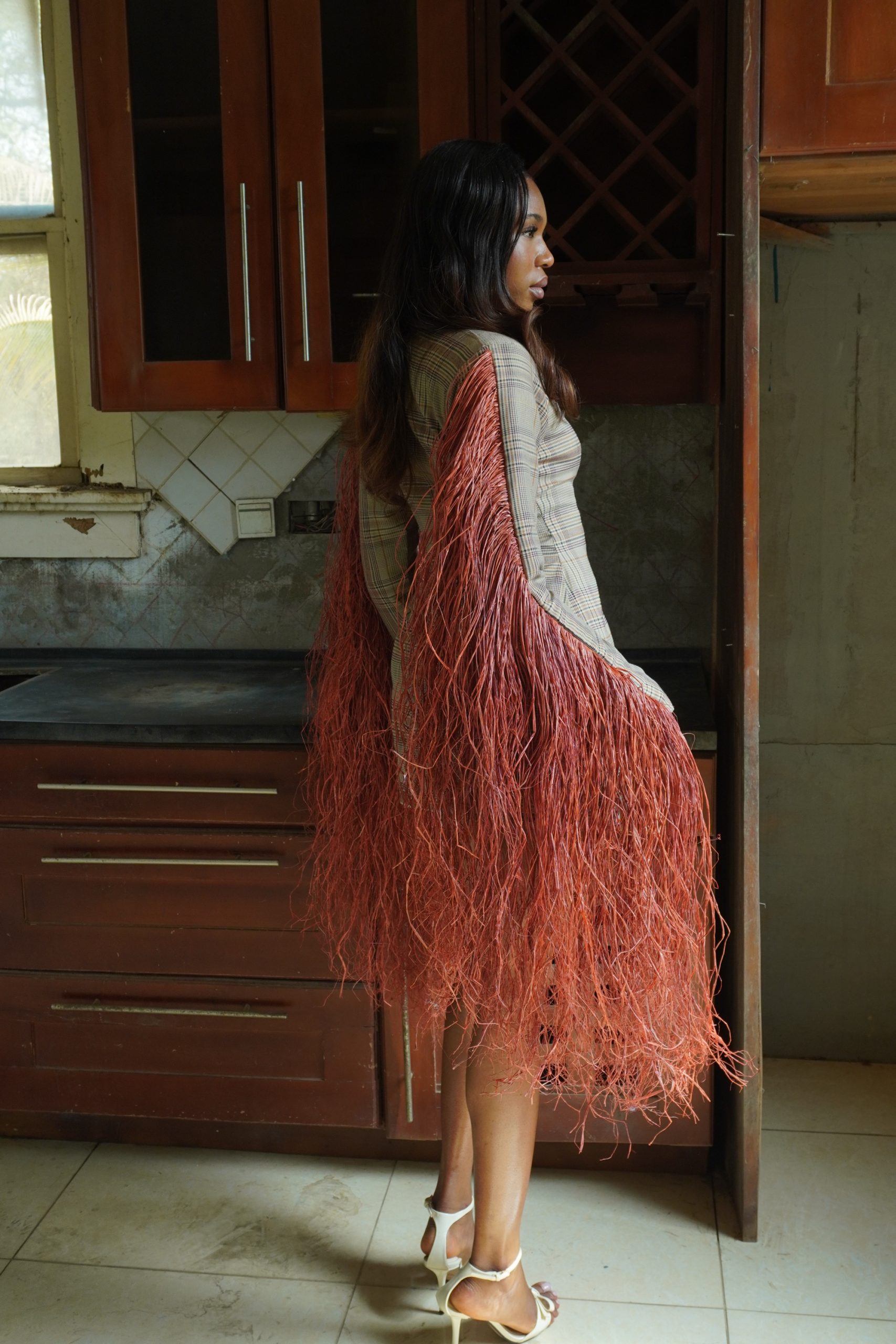 Designed with a waist-defining, corset-inspired shape (without restrictive boning), the blazer sculpts the body effortlessly. Exaggerated raffia fringe cascades from the shoulders down the sleeves, adding movement, texture, and dramatic flair, while seamlessly matching the colour of the suit. Finished in a fine houndstooth pattern, the fabric adds subtle depth and sophistication without overwhelming the design.