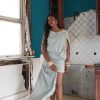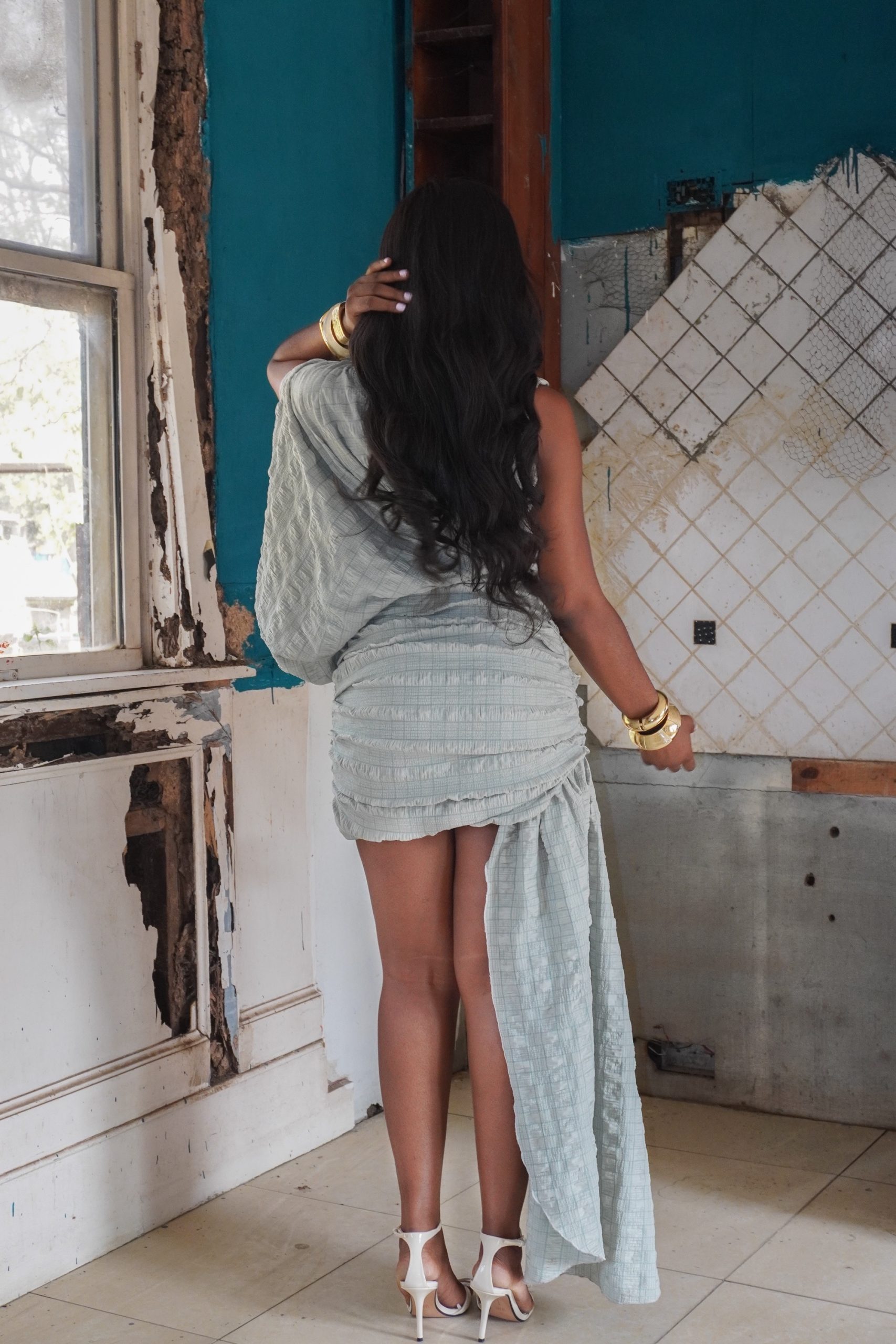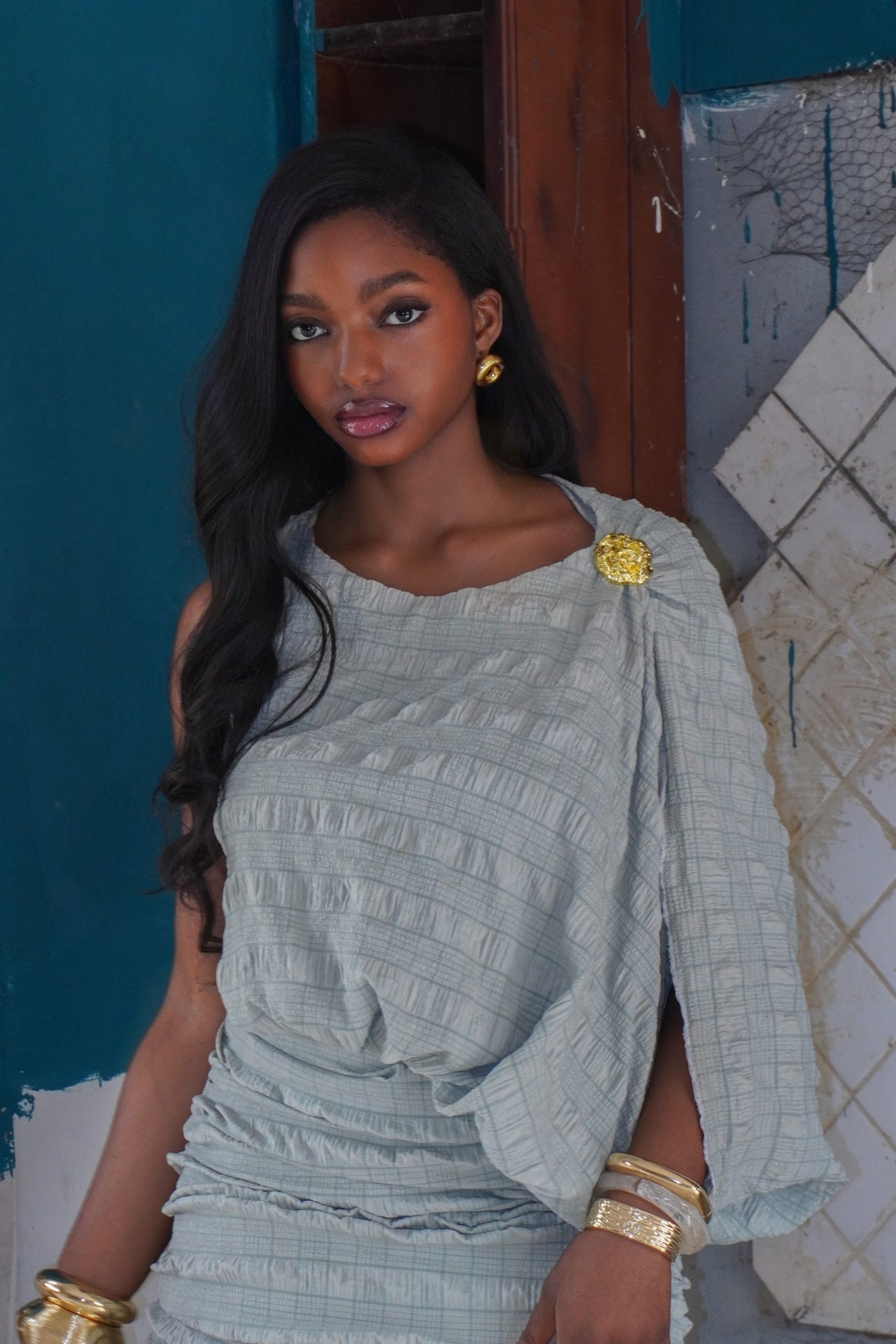 A softly structured mini dress designed to move with quiet confidence. Crafted from a textured, crinkle fabric, this piece features an asymmetric drape across the bodice with gentle gathering that contours the body without clinging. A sculptural shoulder detail is finished with a statement gold brooch, adding a subtle focal point.